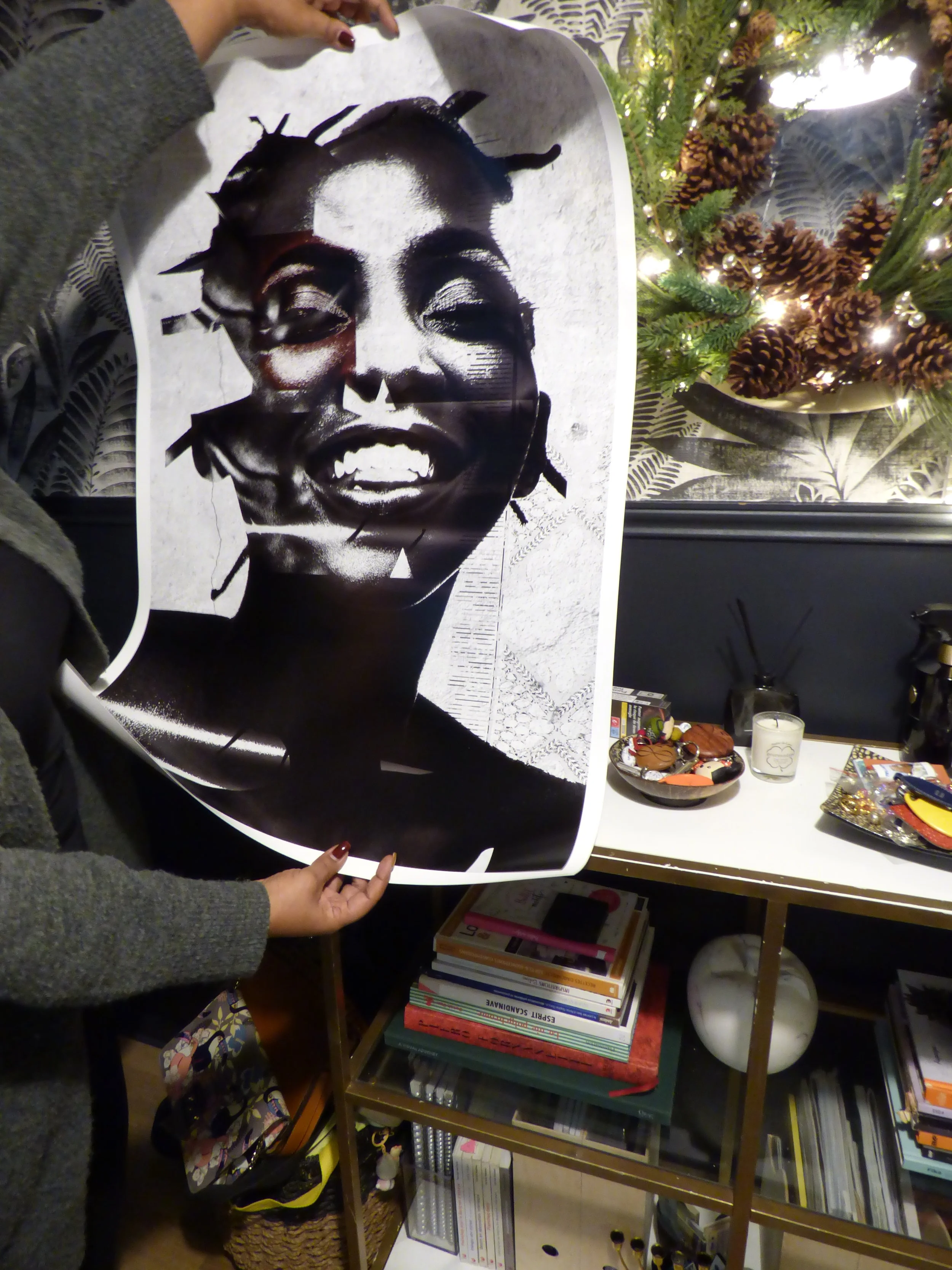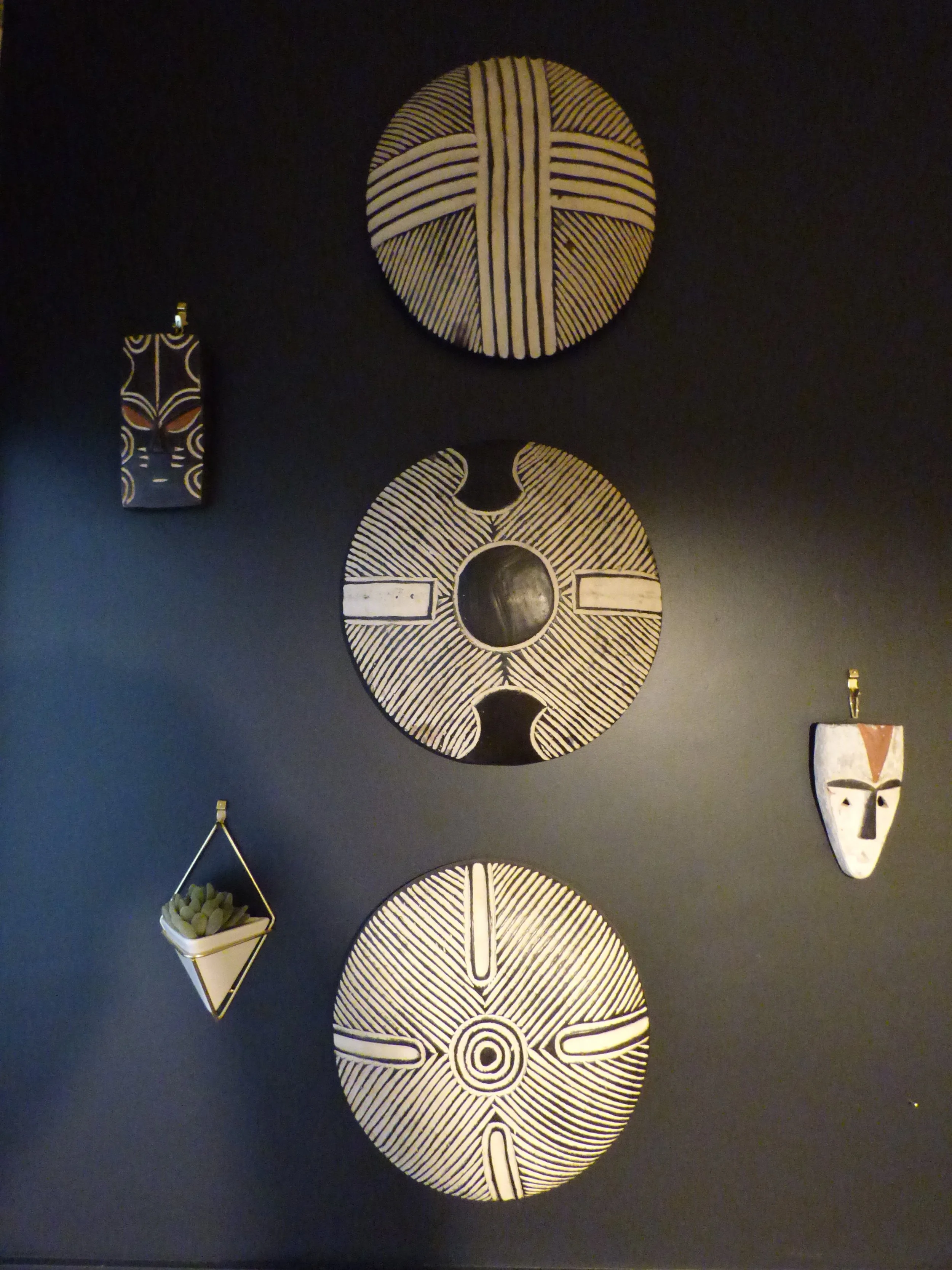 Souvenirs d’un voyage au Gabon mis en valeur grâce au noir profond de l’entrée et du couloir. L’artisanat procure à Noémie une réelle émotion, au quotidien il l’inspire et à du sens.