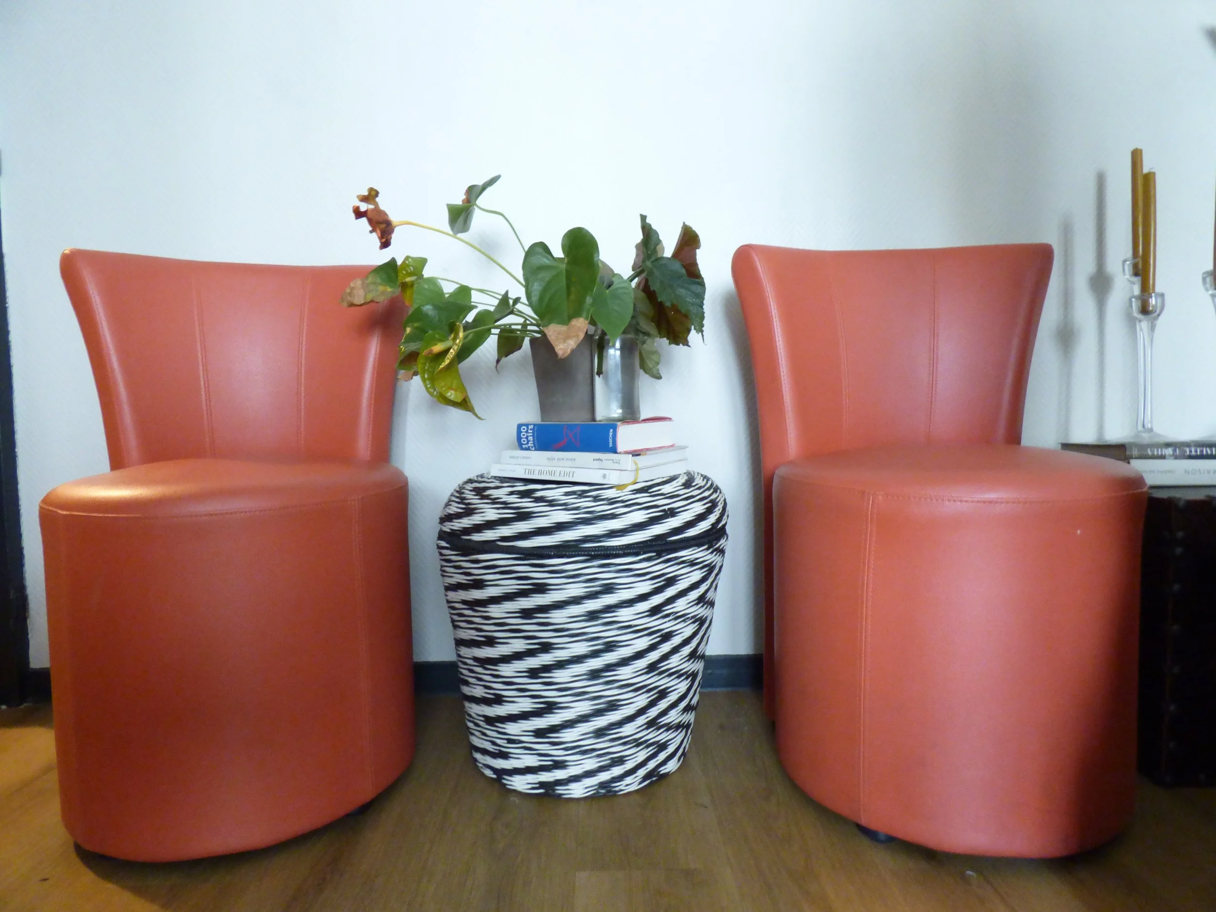 L’esprit vintage s’invite chez Noémie avec ces fauteuils récupérés qui contrastent avec ce panier ethnique.