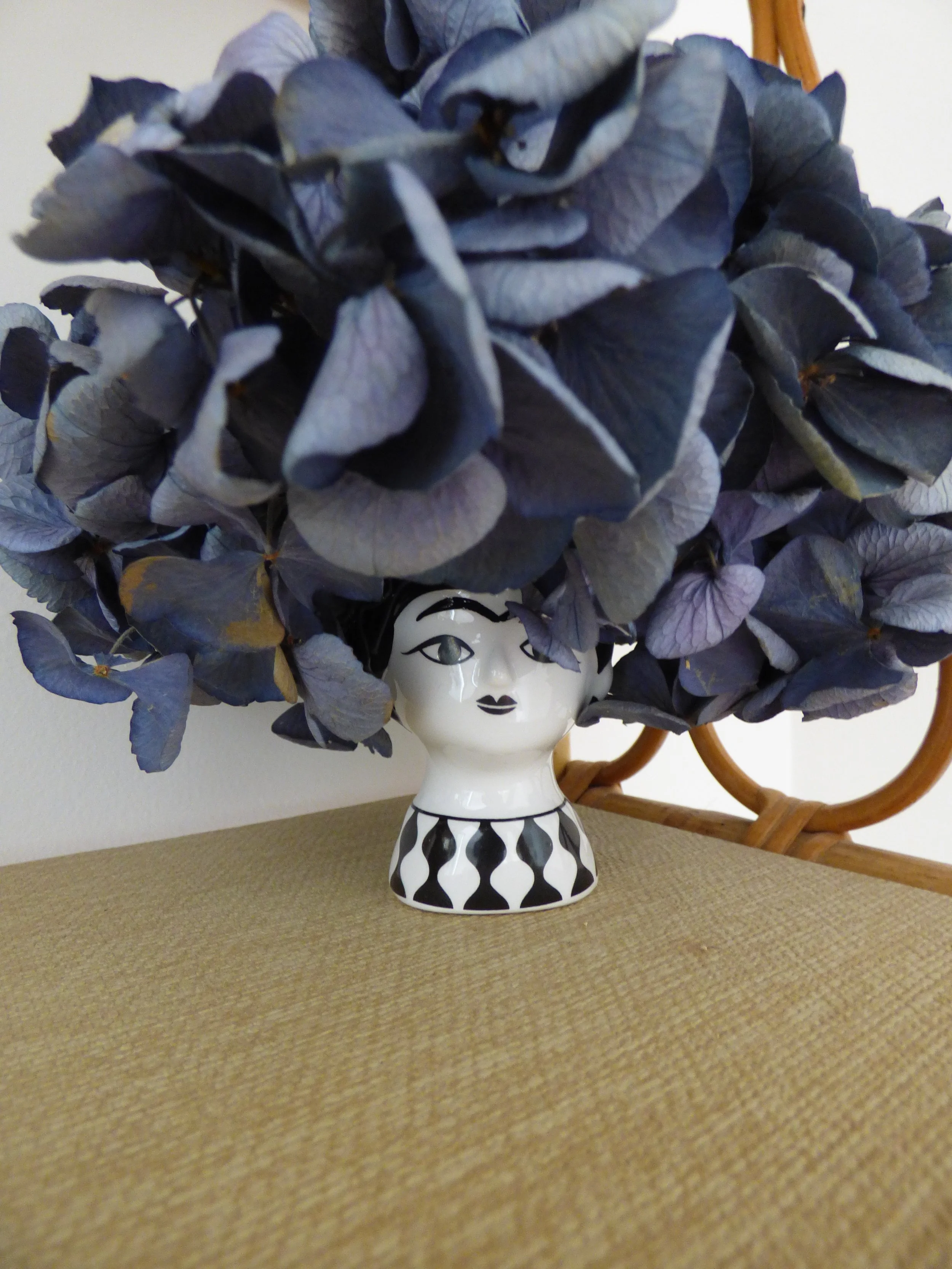 Cette jolie étagère vintage accueille boutures et fleurs séchées… Un buddha artisanal de Birmanie veille sur le salon. Coupe XXL pour ce coquetier détourné de sa fonction première qui offre un écrin à un bel hortensia séché. Ici on aime quand la déco ne se prend pas la tête ;-)