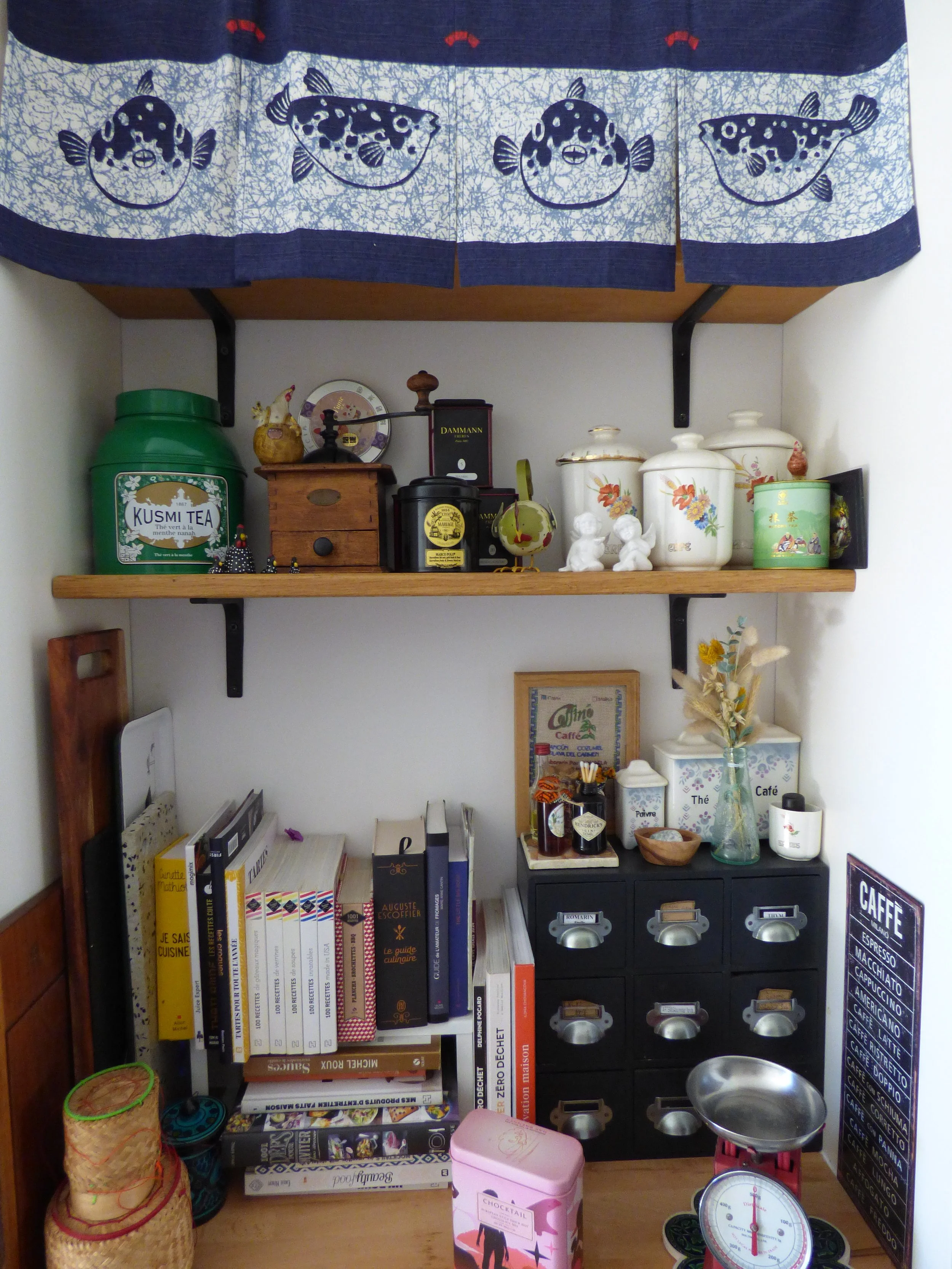 Dans la cuisine, on a privilégié l’aspect pratique mais quelques touches déco se sont tout de même imposées et un espace d’exposition a été créé entre deux colonnes grâce à un module bas de la grande distribution et des étagères en chêne soulignées d’équerres noires. Boîtes à thés, pots à épices anciens, paniers à vapeur chinois, balance et vieux moulin à café mais aussi livres de recettes et meuble à thés.