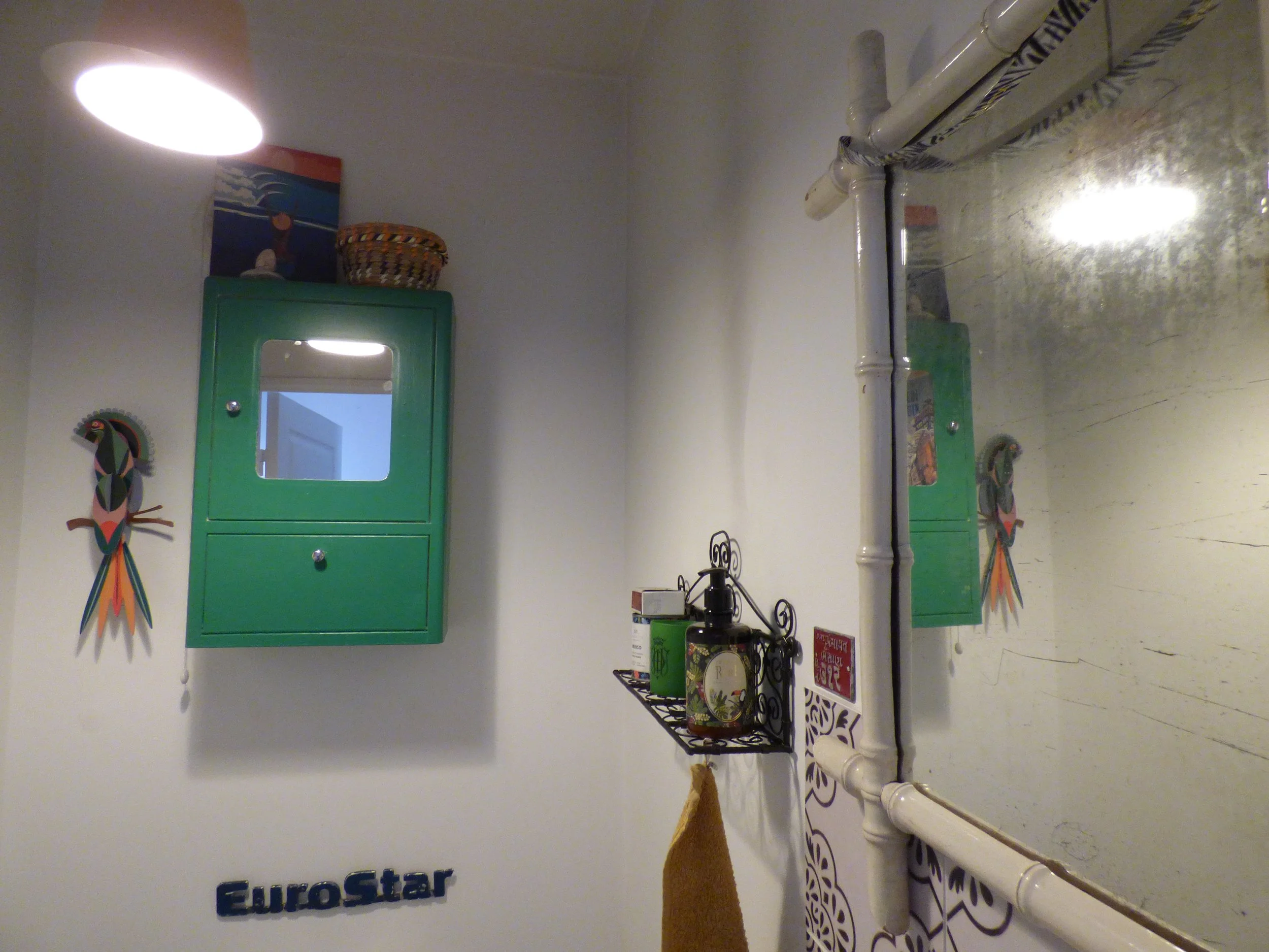 Dans la pièce trop souvent oubliée de la maison. Une armoire à pharmacie et un miroir, tous deux vintages, une étagère en fer forgée marocaine, quelques décorations décalées, une touche d’humour et des stickers effets carreaux de ciment et le tour est joué.