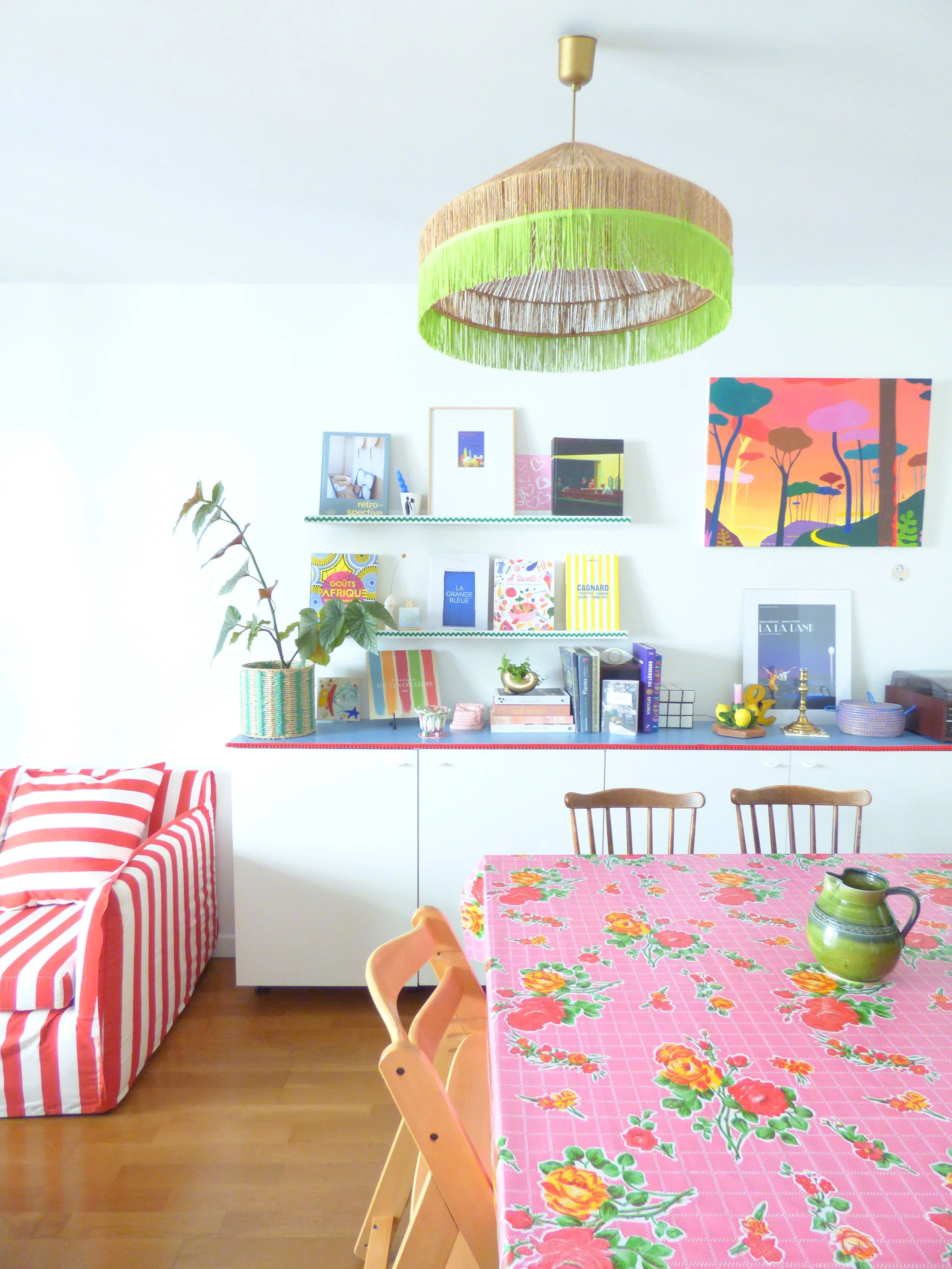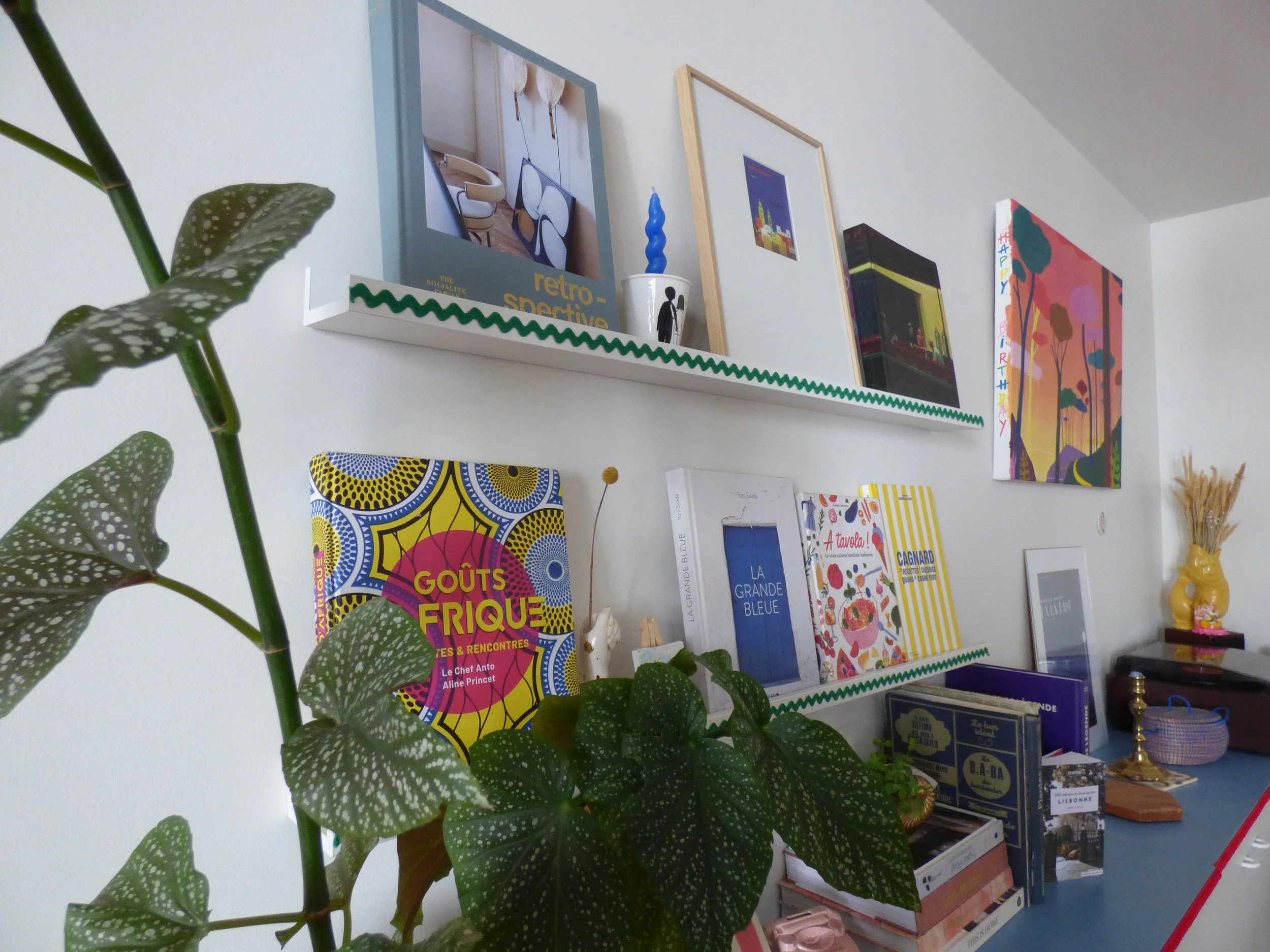 Astuce : les tranches du plateau en médium peint et les étagères à cadres ont été habillées de galon en tissus.