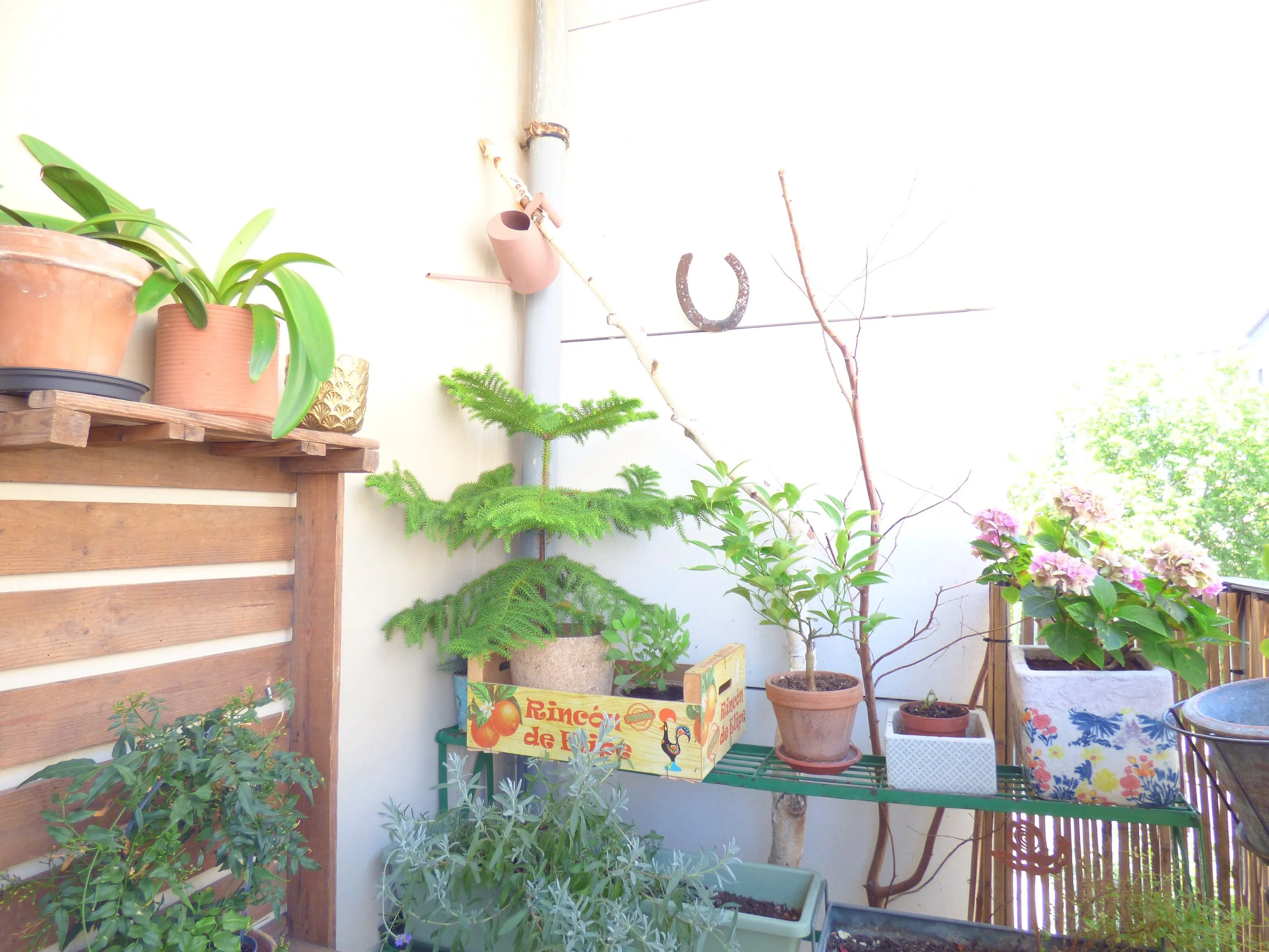 Des branchages, un fer à cheval, un petit arrosoir, sapin, citrus, olivier, hortensia, jasmin, rosier et plantes aromatiques composent notre jardin de ville.